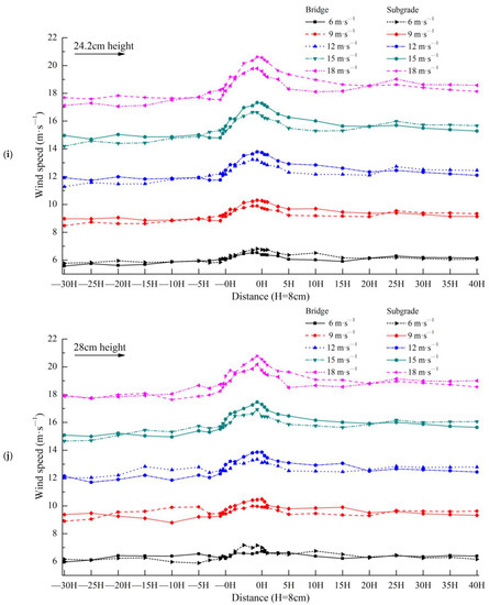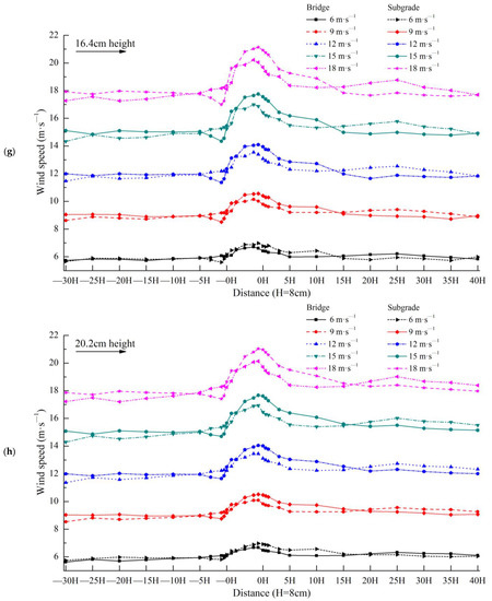 When the height of the observation point was 16.4 cm (Figure 6g), from −30H to −5H, the wind speed of the bridge and subgrade had a minimal overall difference. From −3H to −0.5H, the wind speed of the bridge is higher than that of the subgrade. From −0H to 10H, the wind speed of the bridge was lower than that of the subgrade. From 15H to 40H, the wind speed of the bridge and subgrade had minimal difference overall. The variation range of the bridge wind speed was lower than that of the subgrade at the height of 16.4 cm.