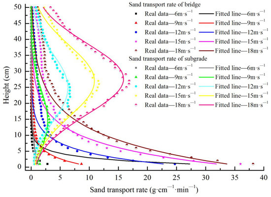 The test results of the sand transport of bridges and subgrades are shown in Figure 8 and Table 1, based on the test layout of sand transport in the wind tunnel. The sand transport rates of the bridge for each height followed the distribution law of exponential functions, whereas the sand transport rates of the subgrade varying with height followed the distribution law of Gaussian functions. Under the experimental wind speeds of the five groups, the sand transport rates of the bridge were 7.56, 39.24, 141.05, 273.03, and 374.30 g·cm−1·min−1, and those of the subgrade were 9.56, 66.92, 164.16, 296.08, and 431.43 g·cm−1·min−1, respectively. The average sand transport rate of the bridge was 86.27% of that of the subgrade. The sand fluxes of the bridge were obviously lower than those of the subgrade, indicating that the passing rate of the wind-blown sand flow of the bridge was lower than that of the subgrade. Compared with the subgrade, the bridge blocks more wind-blown sand transport and causes more sand material to accumulate near the bridge.