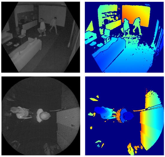 Example frames from our dataset. (Top): a scene from tilted view, (Bottom): a scene from top-down view. (Left): IR image, (Right): Depth image with depth encoded as color.