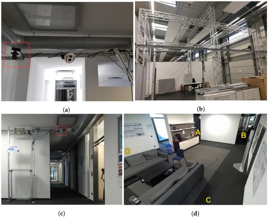 Recording setups used for capturing the dataset. The position of the Azure Kinect is marked with a red square. (a) Camera mounting for tilted-view in Scene 1. (b) Setup for top-down view in Scene 2 (camera not installed yet). (c) Setup for top-down view in Scene 1. (d) Entrances in in Scene 1. Subjects were told to use specific entrances during recording (e.g. enter at A and leave through D).
