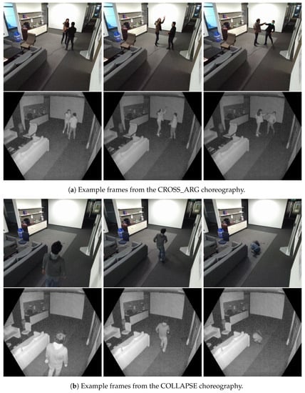 The test cases were defined prior to recording according to a test matrix, which aims at preventing unintentionally introduced correlations in the dataset. The anomalies in the anomaly dataset also belong to pre-defined test cases. The camera was calibrated according to a world coordinate system before each recording session. For recording, the test subjects were instructed to enter and leave the scene through a specific entrance. For the tilted-view scene, there are four such entrances. In the top-down-view scenes, the test subjects cross the scene either in the X- or Y-direction of the camera coordinate system. The subjects perform a given action after entering the scene and then leave again. The instructions on how an action was to be performed were kept rather vague in order to have some degree of variance between performances of the same action type. A full list of the choreographies can be found on the dataset website https://vizta-tof.kl.dfki.de/building-data-format/ (accessed on 22 April 2022).
