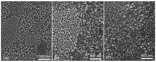 SEM images of the surface morphology of the LSMO films grown with different Sr content (x) and constant content of Mn excess (y = 1.15) are presented in Figure 1. The surface of the films having x = 0.08 (see Figure 1a) contain mostly triangular-shaped crystallites with some polygonal-shaped grains. Moreover, some larger islands of different shapes and size of crystallites are observed, which can be caused by the peculiarity of the polycrystalline substrate. It has to be noted that polycrystalline Al2O3 substrates are made from an ingot that consists of grains of about 2 μm in dimension. When bulk ceramic is cut into plates, the surface of the substrates is formed by grains of different sizes and crystallographic planes. Therefore, during the initial growth process, the LSMO film starts to grow on different planes and sizes of Al2O3 crystallites, which results in some islands with different shape and size of the crystallites. One can see that some islands show well-ordered crystallites with a triangular shape. As it is known, Al2O3 has a trigonal Bravais lattice close to hexagonal. Most likely, in these places of the substrate the crystals of Al2O3 are oriented in the C-plane parallel to the surface, and at the initial stage of the film growth the nuclei are oriented so that their pseudocubic axis [111] is perpendicular to the surface. As a result, a well-oriented film texture is obtained. In other areas of the substrate surface, the crystallites grow with a more disoriented structure. The surface morphology of the films with x = 0.18 (Figure 1b) is a little bit different. These films consist of crystallites whose surfaces are not only like triangles, but the elongated rectangular-shaped crystallites start to dominate. A further increase in Sr content (Figure 1c, x = 0.30) leads to the dominance of crystallites with this elongated rectangular surface. Moreover, islands with crystallites of a smaller triangular shape also exist in all samples. The average dimensions of the crystallites do not strongly depend on the Sr content. The most frequently found crystallite dimensions are equal to 75 nm for x = 0.08, 80 nm for x = 1.18, and 85 nm for x = 0.3. The change in the shape of the crystallite surface depending on the concentration of Sr atoms can be caused by the deformation of the crystalline lattice or change in the crystalline structure. This can result in the preference of crystallite crystalline orientation in a direction perpendicular to the substrate surface. As a result, a different cut of the crystallite surface takes place.