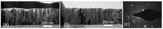 To understand the peculiarities of the growth of the films, TEM images were analyzed. The low magnification cross-sectional TEM images of the films with an Sr content of 0.08 and 0.18 are shown in Figure 2a,b, respectively. As can be seen, the film consists of vertically aligned columns, which are spread throughout the whole film thickness with their long axis arranged perpendicular to the substrate. The typical column width in all films is about 60–75 nm on the upper side and 30–50 nm near the substrate.