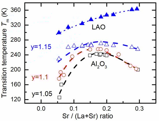 There is a tendency that the higher the Mn/(La + Sr) ratio in the films, the higher the Tm values obtained. Furthermore, at low Sr content, the Mn/(La + Sr) ratio has a stronger influence on the electrical properties. The Tm versus Sr content has a maximum that slightly shifts to lower Sr values with increasing y = Mn/(La + Sr) ratio in the films. It could be explained by induced more La vacancies with the increase in Mn excess, which result in an increase in Mn4+ amount [32]; therefore, less Sr is needed for the same Mn4+/Mn3+ ratio, which is important for transport properties in manganites. The dependence of Tm on the Mn/(La + Sr) ratio for different Sr content shows that the Tm values saturate with increasing Mn/(La + Sr) ratio in the films. This indicates that the Mn/(La + Sr) ratio and Sr content x values of 1.15 and (0.17–0.18), respectively, result in the highest metal–insulator transition temperatures. It is worth mentioning that for epitaxial films grown on LAO, the maximum Tm is obtained for an Sr concentration of x ≈ 0.3 (see Figure 3). As can be seen, in the range of 0.05 ≤ x ≤ 0.3, the Tm of epitaxial films is continuously increasing. Moreover, it is higher than for films grown on the Al2O3 substrate. This difference can be caused by the different microstructure of the films. For polycrystalline films, the conducting mechanism is controlled not only by a double-exchange mechanism between manganese ions Mn3+–O2−–Mn4+, but also by the grain boundary resistivity and the relative quantity thereof [34,35]. As a result, the resistivity of the films can vary greatly depending on the disorder of grain boundaries and the relative quantity of their material.