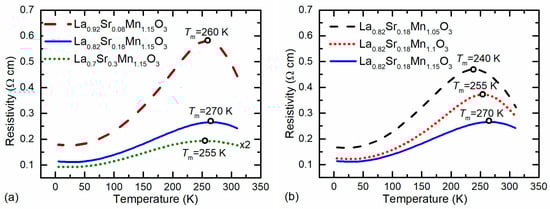Measurements of resistivity vs. temperature dependences of nanostructured LSMO films were performed to investigate the effect of variation in Sr/(La + Sr) and Mn/(La + Sr) ratios on the metal–insulator transition temperature Tm values. The results are summarized in Figure 3.