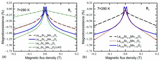 The magnetoresistances dependences on magnetic flux density (B) measured up to 0.2 T at room temperature (290 K) are presented in Figure 5. The magnetic field was applied in parallel to the film plane. For nanostructured films with Sr content of x = 0.18–0.3, a sharp increase in the negative magnetoresistance (the large decrease in electrical resistance) at low fields is observed, which is followed by a slower background negative MR with an increase in the magnetic field (see Figure 5a). These effects are usually called the low-field magnetoresistance (LFMR) and high-field magnetoresistance (HFMR), respectively. Furthermore, one can observe some positive MR changes at low magnetic fields, with maxima attributed to the films’ coercive field. In our investigated samples, the LFMR was strongly dependent on the concentration of Sr. It can be seen that for films with x = 0.3, the LFMR is about –0.8% at 50 mT, while for films with x = 0.08, the LFMR is about –0.48%. At higher fields (0.8 T, not presented in this figure), the HFMR was found –4% and –2.5%, respectively. It has to be pointed out that for epitaxial films grown on monocrystalline LAO substrate the LFMR was not observed in all investigated films (see Figure 5a for x = 0.3). This result could be a confirmation that the origin of the LFMR is mostly related to the crystallite–grain boundary structure of the LSMO films, but not with possible rearrangement of the crystal lattice caused by the change in Sr content. For nanostructured films with different Mn excess (Figure 5b), the similar LFMR values were obtained for y = 1.1 and 1.15, while for 1.05 the LFMR was very small. However, at 0.8 T the highest LFMR = 4.5% was found for film with Mn excess ratio 1.1. Such increase in MR at a higher field could be related with a slightly higher disorder level of grain boundary material (confirmed by higher resistivity values). Therefore, the higher magnetic field could align Mn moments and as a result the resistance change with magnetic field is larger. It should be noted that the LFMR is usually not observed in epitaxial films or monocrystalline manganites [20], but found in films with a large number of grain boundaries having a noncollinear spin structure in which spin-polarized transport (tunneling) across the grain boundaries dominates. The LFMR is more pronounced at low temperatures and depends on the thickness and type of grain boundaries, because they decouple the neighboring ferromagnetic (FM) grains and provide an energy barrier for spin-polarized tunneling of electrons. The LFMR usually vanishes at room temperature, at which the grains become paramagnetic. However, as we can see in Figure 5, this effect can be also obtained at room temperature for the special chemical composition of nanostructured films. Such a result is promising for the application of LSMO films for low magnetic field sensing at room temperature. It is also worth noting that the LFMR continuously increases with increase in Sr concentration. This is in contrast to the dependence of Tm on Sr content for nanostructured films (see Figure 3), for which we observe a decrease in Tm when x > 0.2. Moreover, the Mn excess significantly influences the LFMR values of the films. This effect was observed at room temperature only for Mn concentration higher than y = 1.1. It can be seen in Figure 5b that for Mn concentration y = 1.05 (almost stoichiometric films), the LFMR is insignificant.