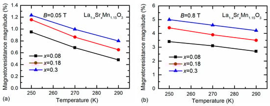 As it was already mentioned, the low-field magnetoresistance is more pronounced at low temperatures. The MR of nanostructured LSMO films with Mn excess y = 1.15 was measured in the temperature range of (250–290) K. Figure 6 presents summarized results obtained at two magnetic flux density values: B = 0.05 T (a) and 0.8 T (b). One can see that the MR values gradually increase with decrease in temperature and are the highest for the films with x = 0.3. Therefore, the nanostructured films with chemical composition La0.7Sr0.3Mn1.15O3 could be used for magnetic field sensor applications at room temperature.