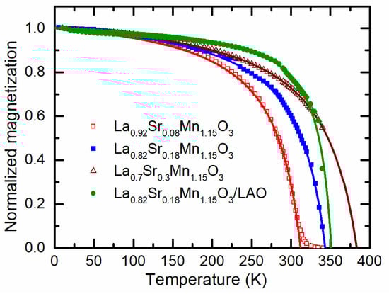 Symbols—temperature dependence of field-cooled (FC) (HFC = 1000 Oe) magnetization normalized to magnetization at 10 K for films with different Sr content and constant Mn content y = 1.15. Lines—fitting results for the approximation with the Curie–Weiss law (1).