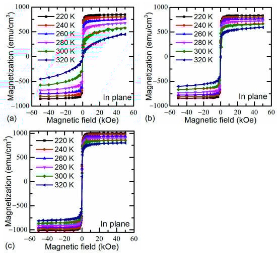 Magnetic hysteresis loops of LSMO films with different Sr content ((a) La0.92Sr0.08Mn1.15O3, (b) La0.82Sr0.18Mn1.15O3, (c) La0.70Sr0.3Mn1.15O3) at temperature range of 320−220K along the in-plane direction.