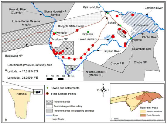 Study area, main roads, rivers, conservation areas, and field work way points for high resolution (2 cm) UAV data in (a). In (b), the map of Namibia, and (c) map of major soil types.