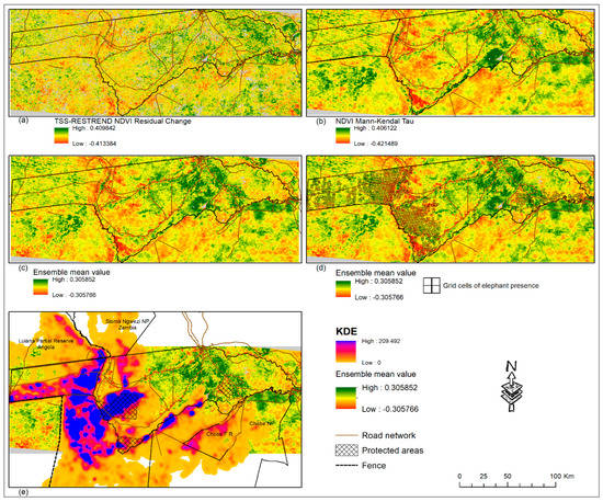 (a–e) show the output of the TSS.RESTREND, Mann–Kendall, ensemble, and kernel density estimate (KDE) analysis over the whole Zambesi region. In (a), the Residual Change of the TSS.RESTREND and (b) is the Mann–Kendall Tau. In (c) is the ensemble of the mean values of RESTREND, TSS.RESTREND, (d) the spatial distribution of elephant sightings overlayed over the ensemble mean value from (b) above and (e) the overlay of the Kernel Density Estimate (KDE), and Mann-Kendal Tau from (b) above. No data and background values are displayed as grey.