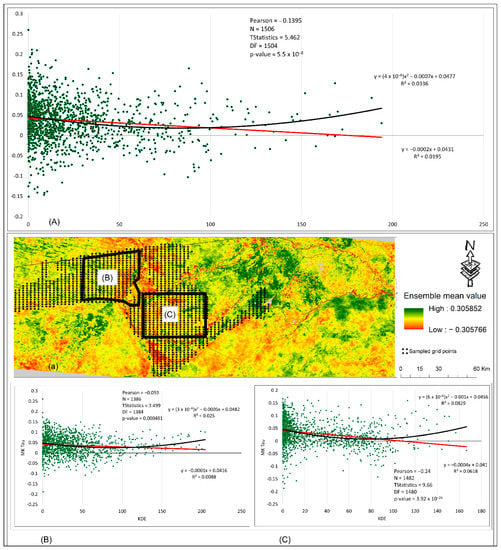Figure 3 shows the Pearson correlation between the Mann–Kendall Tau and the Kernel Density Estimate of the elephant data. Over the whole Zambezi (Figure 3A), as well as in the western (Figure 3B) and eastern areas (Figure 3C), there is a clear negative trend (browning) indicated by the red straight line. In the whole Zambezi area (Figure 3A) and in both sub-sampled locations (Figure 3B,C), the negative trend (browning) is significant (p-values = 5.5 × 10−8, 0.0005, and 3.93 × 10−24). Additionally, the results (Figure 3A–C) show that as the density of elephants decreases away from the KDE core areas, vegetation greening begins to occur (black polynomial line, Figure 3A–C). It is noteworthy that the polynomial line increase related to high KDE densities probably indicates that large herds are attracted to abundant vegetation resources. Moving further to the eastern part, we observed browning around and within the Salambala core area, located east of Lake Liambezi (Figure 2c). The Salambala core area is also home to elephant herds (Figure 2e). In addition, we also observed browning close to and around roads (Figure 2, Figure 3 and Figure 4). These roads are locations of high-density human settlements where cattle grazing and extensive agricultural activities are a common practice. On the other hand, we also observed some relatively high greening, mostly around Lake Liambezi, communal areas, as well as some locations of the floodplains (Figure 2, Figure 3 and Figure 4).