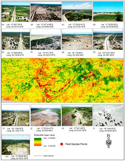 Shows aerial images from our 2019 field survey in the Zambezi region (a–m). In (A), the labels (a–m) correspond to the images shown with their respective GPS coordinates at the sample locations (red circle with black dot in the middle). Additionally, in (A), we use the same ensemble as in Figure 2b above for reference purposes.