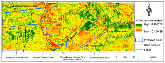 In addition, we performed a pixel wise Mann–Kendall statistics test of the NDVI time series to determine the trend of total vegetation change in the Zambezi, and the Sen’s Slope to determine the magnitude of the change [72]. Mann–Kendall is a non-parametric test and does not rely on a particular data distribution but rather on the relative magnitude of the sample data [83,84].