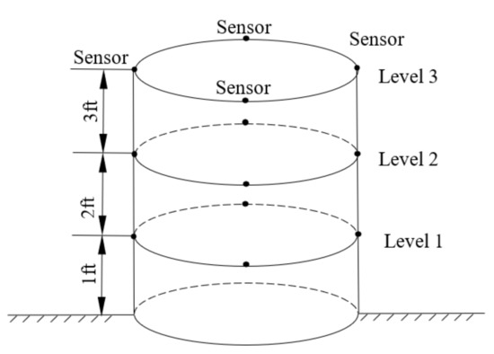 Some detailed information about the three tested wooden utility poles is listed in Table 4. The measurement location of each accelerometer or sensor is shown in Figure 4. The four accelerometers were placed at 90° from each other on the same layer circle, and there were three levels for each tested wooden utility pole. Due to the symmetry of the three wooden utility poles, the data collected from each accelerometer at every level had similar information. The data from sensor 4 at level 1 of each tested wooden utility pole was analyzed in field testing here.