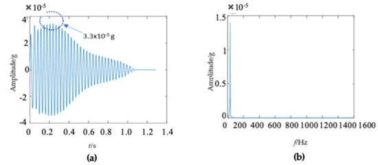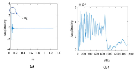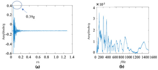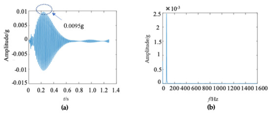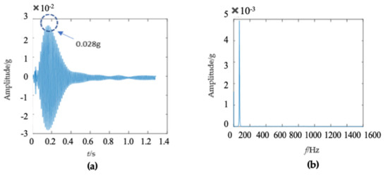 Vibration response signal and frequency spectrum of the wooden utility pole labeled as 265173: (a) the vibration response in the time domain and (b) the frequency spectrum.