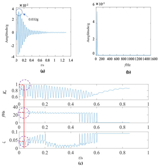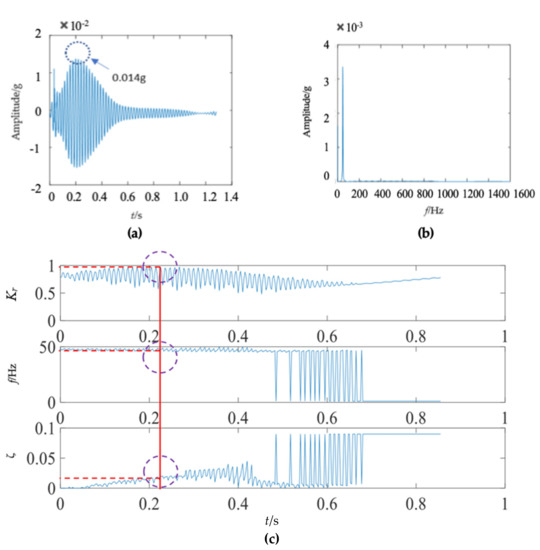 First mode in the vibration response signal of the wooden utility pole labeled as 57704: (a) the vibration response of the first mode in the time domain, (b) the frequency spectrum of the first mode, and (c) the results of Laplace wavelet correlation filtering of the first mode.
