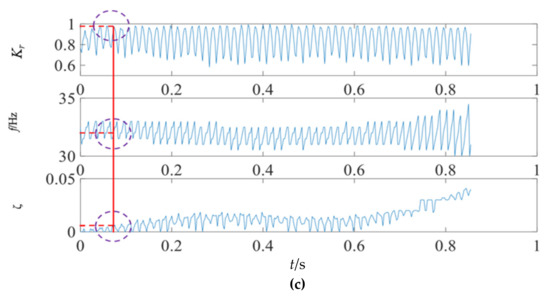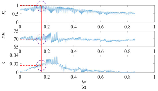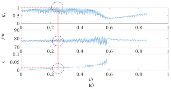 The first mode of the vibration response signal of the wooden utility pole is shown in Figure 7. The instantaneous frequency and damping factor of the decomposed signal of each single mode were extracted using Laplace wavelet correlation. The result of the correlation coefficient Kτ was close to 1 when a particular Laplace wavelet successfully matched with the single mode of the signal, as shown in Figure 7c. The second and third subgraphs in Figure 7c indicated the instantaneous frequency and damping factor with the maximum correlation coefficient Kτ at time τ. The red vertical line in Figure 7c indicated the time τ when the correlation coefficient Kτ reached the maximum value. The purple dashed circles indicated the instantaneous frequency and damping factor corresponding to the maximum correlation coefficient Kτ at time τ. The decomposed vibration response of each single mode in the time domain, its corresponding frequency spectrum, and the results of Laplace wavelet correlation filtering were also obtained. Due to the space limitation of this paper, only the results of the first three modes are displayed in Figure 7, Figure 8 and Figure 9. The maximum correlation coefficients Kτ of the first three modes of the wooden utility pole labeled as 57704 were 0.981, 0.9798, and 0.9841, as shown in Figure 7c, Figure 8c and Figure 9c, respectively. Instantaneous frequencies of the first three modes of the wooden utility pole labeled as 57704 were 25.5 Hz at 0.0375 s, 47 Hz at 0.225 s, and 70 Hz at 0.16 s, respectively. The damping factors with the maximum correlation coefficients Kτ of the first three modes were 0.042, 0.0185, and 0.018, respectively. Instantaneous frequencies and damping factors of decomposed signals of the first 20 modes are listed in Table 5.