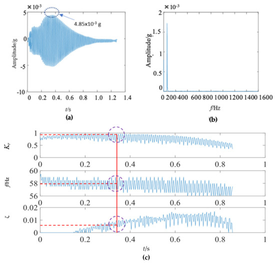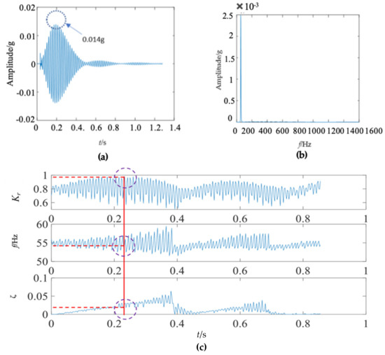 Third mode in the vibration response signal of the wooden utility pole labeled as 57704: (a) the vibration response of the third mode in the time domain, (b) the frequency spectrum of the third mode, and (c) the results of Laplace wavelet correlation filtering of the third mode.