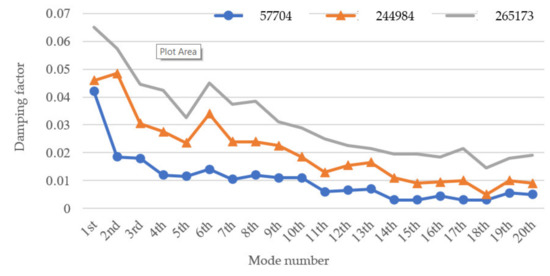 In order to observe the rules of the obtained instantaneous frequencies and damping factors from measured vibration response signals of the three wooden utility poles labeled as 57704, 244984, and 265173, the extracted instantaneous frequencies and damping factors of the three wooden utility poles are shown in Figure 20 and Figure 21, respectively.