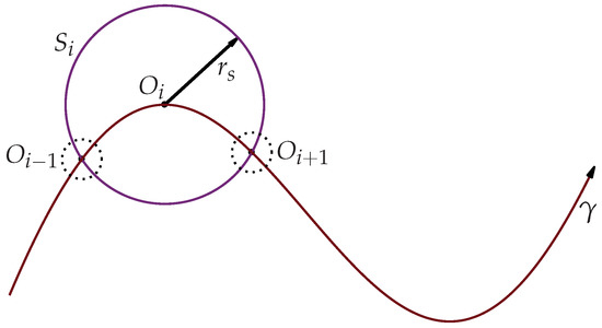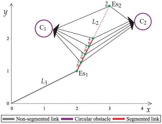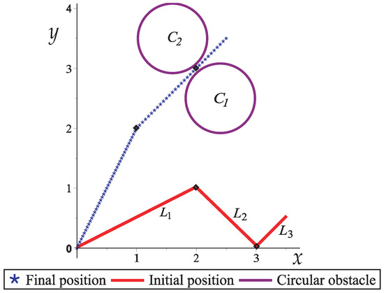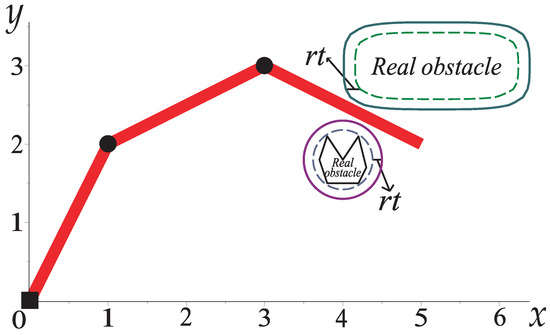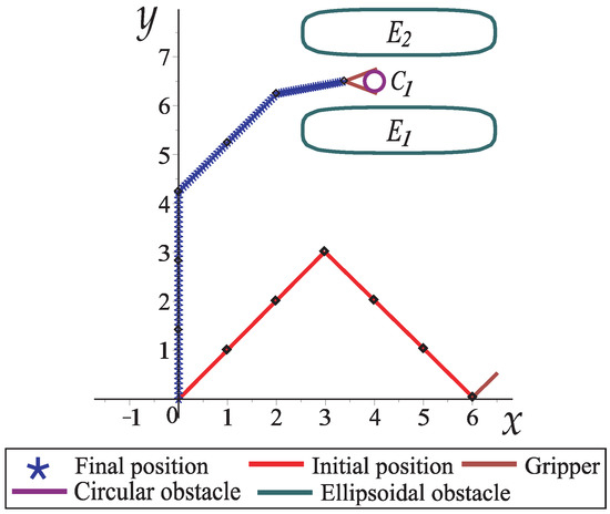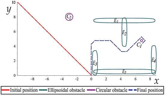 - Capturing of the workspace. In this step, a camera or system to capture the environment is used to generate the geometrical representation of the robot’s workspace. This procedure requires an image-processing algorithm; however, this is not a topic of this work; thus, the workspace is considered known a priori. Then, for this work, only circular obstacles (21) and ellipsoidal obstacles (22) are considered to represent the workspace in the case studies of Section 5.