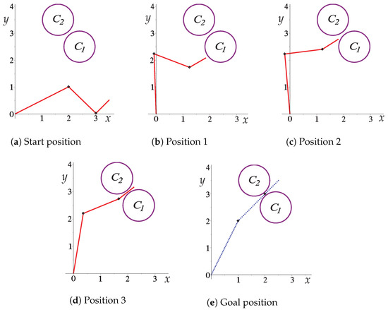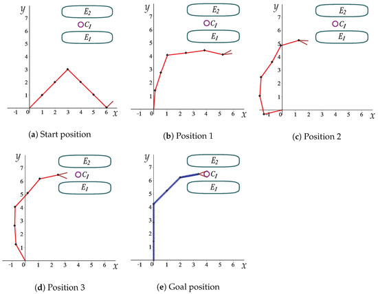 - First, the workspace to be solved was established. A three-link robot arm with normalized dimensions regarding the CRS CataLyst-5 robot was used. The circular obstacles had a tolerance radius , which guaranteed no collision of the robot arm with the obstacle (foam balls). For this case, two goals (goal1 and goal2) were set and are depicted in Figure 22 by the line formed by gray boxes and the blue line formed by asterisks, respectively. The movements of the robot arm are semi-transparent. The robot arm first reaches Goal 1 (the first homotopic path has been followed). Then, the endpoint of this path is used as the starting position to obtain the second homotopic path and reach Goal 2. In this way, a single path is obtained capable of avoiding obstacles and meeting both goals. The computation time and memory consumption were 2 milliseconds and 0.924 KB, respectively. The sequence of movements is executed by the robotic arm, as shown in Figure 22a.