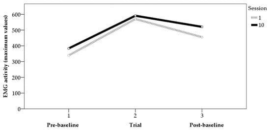 EMG activity (maximum values) pre-baseline, trial, and post-baseline (sessions 1 and 10).