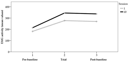 EMG activity (mean values) pre-baseline, trial, and post-baseline (sessions 1 and 10).