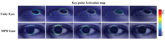 Because we aimed to estimate a gaze vector centered on a landmark extraction, a labeled gaze vector and eye-landmark dataset were essential. However, because gaze data are very expensive and difficult to generate, it is more difficult to obtain a dataset that provides both high-resolution images and landmarks simultaneously. Therefore, UnityEyes, a synthetic eye-image dataset with eye landmarks, was adopted as a training dataset through high-resolution images and an automatic labeling system. The model was trained by processing 32 iris and 16 eyelid points from the eye image obtained by fixing the head pose. Figure 1 shows the predicted heatmaps during the training We evaluated landmark and gaze performance by composing a test set for UnityEyes and performed a gaze performance evaluation using MPIIGaze [11], which has real environment settings.
