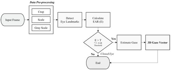In this section, we introduce a network structure and a process for extracting a rich and accurate landmark feature vector from an eye image and then estimating a gaze based on it. A series of procedures for estimating a proposed gaze is shown in Figure 2. Eye images can simply be acquired from a single camera. If a frame contains a full-face image, the frame must be cropped to a sized image centered on the eye area using the face detection algorithm [32]. The image is converted into black and white image for simple processing. This can enhance the performance output of the infrared camera.