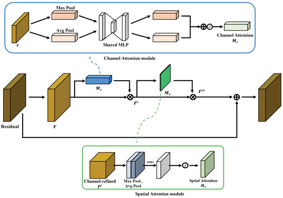CBAM adds two sub-networks that consist of channel attention and spatial attention networks to the basic residual block. Feature is generated through a convolution of the residual, which is the output of the previous block. F goes through the channel attention and spatial attention networks sequentially. First, in the case of channel attention, the two types of channel-wise pooling, that is, max pooling and average pooling, are performed to obtain weight parameters for channels. Feature vectors and , generated through pixel-wise pooling, share an MLP that has a bottleneck structure with the advantages of parameter reduction and generalization and are merged using element-wise summation. Finally, the product is normalized using sigmoid function to obtain the meaningful weights and generate by multiplying and F. The above process is described by using Equation (2).