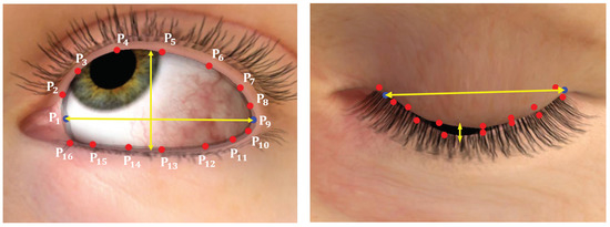 To reduce false positives and increase efficiency, we utilized an EAR value. The EAR value was calculated to decide whether an eye was closed or not using 16 eyelid points. We introduced a new EAR metric based on a method that uses 6 points because we could obtain richer, high-quality eyelid points. Figure 5 shows the measured lengths of an eye using images that include a closed eye. We measured the horizontal length through the and points out of a total of 16 points , and the average value of the remaining seven pairs of points was defined as the vertical length. The EAR was calculated using Equation (4).