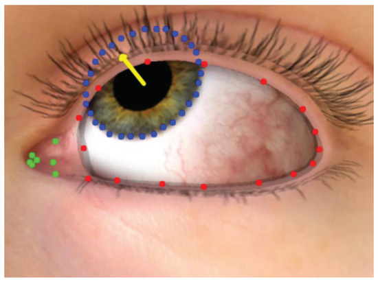 An annotated sample from UnityEyes. The red, green, and blue points are 16 eye edges, 7 caruncles, and 32 iris edges, respectively. The yellow arrow represents the 3D gaze direction.