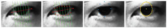 Figure 9 illustrates an overview of this labeling tool. First, when a user draws a point on both endpoints of an eye, a line connecting the two points and straight lines dividing the line into eight equal parts are created. Subsequently, the remaining eye-edge co-ordinates are obtained by dotting the points at which the eight straight lines and eye region overlap. At this time, a correction effect is applied so that the drawn points lie on the straight lines. When a total of 16 eye edges are completed, the user specifies an elliptical area that can include the iris area. When eight dots are obtained, an ellipse is generated that best contains the iris through the RANSAC algorithm [37]. Users obtain 32 iris edges spaced at regular intervals from the ellipse. The datasets and code on 12 April 2022 are available to the public: https://github.com/OhJaeKwang/Eye_Region_Labeling.
