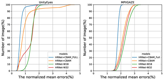 We compared our approach to a baseline model. Two approaches were introduced as follows. The first added a CBAM residual layer and the second applied CBAM to convolution blocks of all stages. We used the model parameters trained on UnityEyes. The landmark detection results of our approaches and the baseline model (HRNet-W18) with respect to MPIIGaze and UnityEyes are shown in Table 4. HRNet-w18 and HRNet-w32 are lightweight models of HRNet, and 18 and 32 indicated the channel multiples of the last stage. In the results, each approach showed a better performance than the existing model, and the final model achieved an approximately 4% higher NME score compared to HRNet-W18 on all datasets. Graphs showing the ratios of the test sets according to the NME value are presented in Figure 10. Similarly, the AUC [39] value (the area under the curve) demonstrated that the two approaches using self-attention improved performance.
