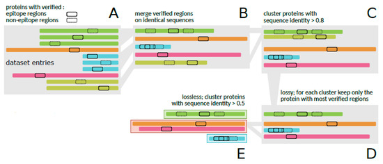 Firstly, the amino acid sequences of identical proteins were joined together, but keeping the information about their verified regions (30,556) (Figure 1A,B), resulting in a reduced dataset of 3158 proteins. Then, to attenuate the redundancy of very similar amino acid sequences, clusters of all sequences were generated with the CD-HIT tool [35], using a threshold of 0.8 (Figure 1C). As a result, 1798 groups of sequences were generated, in which, from each group, only the sequence that contained the highest number of verified regions was retrieved (Figure 1D), resulting in 24,610 regions. The grouping step was again applied to the reduced dataset, but used a threshold of 0.5 (Figure 1E), resulting in 1378 groups of sequences [13].