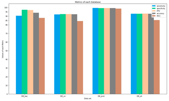 All sets used presented a ROC curve with accuracy greater than 86%, and the protozoan database (DB_prot) presented the best accuracy index, at approximately 99.45%. The worst rate was revealed by the viral database, a figure of approximately 86.89%. The other sets were within this range, obtaining approximately the values of 94.54% and 92.89% for DB_bac and DB_all, respectively.
