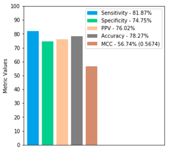 From the ANN diagnosis, all the metrics briefly discussed in Section 3.7 are applied. Figure 5 presents, in detail, the values achieved.