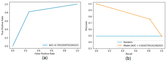 According to Figure 5, it can be seen that the model obtained promising indexes for all the metrics used [3,12,13]. The MCC with the value of 0.5674 indicates an average prediction, superior to a random one. The other metrics obtained very close values, between 74 to 82%. The ROC curve (a) and the precision-recall curve (b) reached values of approximately 0.7831 and 0.8343, respectively, as shown in Figure 6.