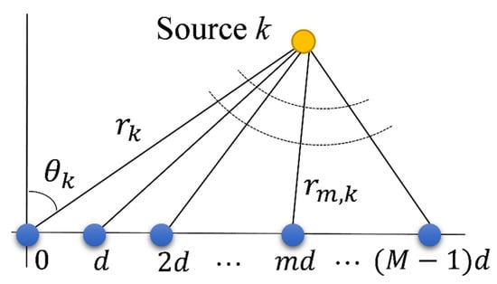Suppose sensor elements space in a uniform linear array (ULA), as shown in Figure 1. The interelement spacing is . Assume that (near-field or far-field) narrowband signal sources impinge on the ULA. The signal received by the m-th () sensor at one snapshot can be expressed as