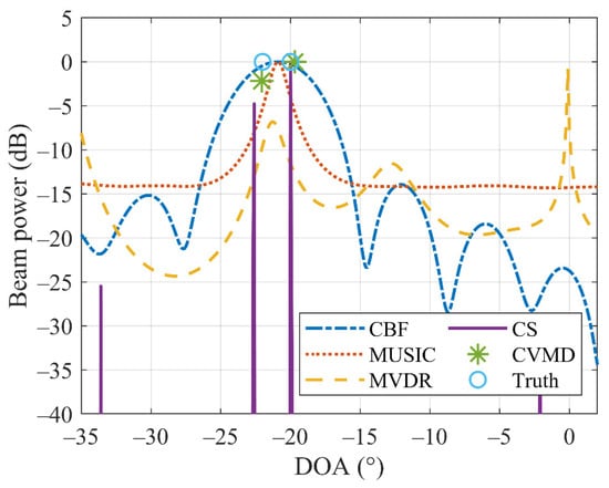 In this simulation, the resolution performance of the proposed method is investigated. The high resolution of DOA estimation is essential for distinguishing and locating adjacent sources. Assume that two coherent far-field sources from −22° and −20° with the same signal-to-noise ratio (SNR) = 20 dB are incident on the array. Figure 2 shows the beam power of the CBF (blue dash-dotted line), MUSIC (red dotted line), MVDR (yellow dashed line), CS (solid purple line), the proposed CVMD method (asterisk marker), and the true DOAs (light blue circle marker). It can be seen that CBF fails to discriminate between the two adjacent sources because of the limitation of the Rayleigh limit. MUSIC and MVDR also failed because of the condition of one snapshot and coherent sources. Despite CS having false targets and CVMD requiring prior knowledge about the number of sources, they retrieve the two sources successfully. However, the simulation running time of the CS-based method is more than four times longer than that of CVMD based method, which will be analyzed in Simulation 3.