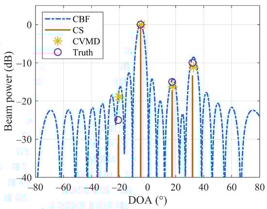 DOA estimation for four sources at −21° with SNR = 5 dB, −5° with SNR = 30 dB, 17.5° with SNR = 15 dB, and 32° with SNR = 20 dB by CBF, CS, and CVMD method.