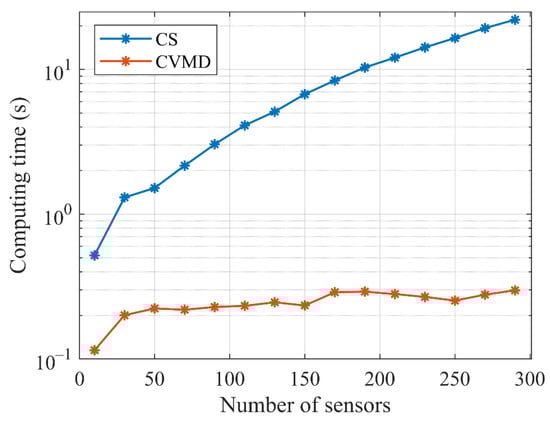 Comparison of computation time for two sources between the CS and CVMD-based methods with the different number of sensors.