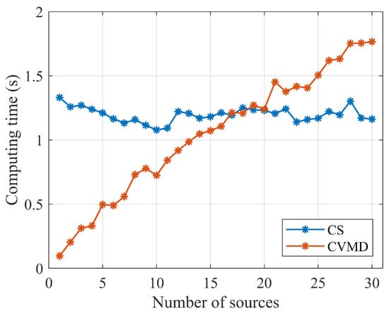 Comparison of computation time for 30 sensors between the CS and CVMD-based methods with the different number of sources.