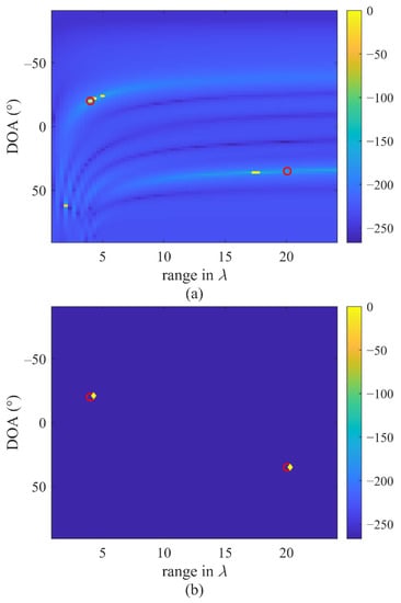 Two near-field sources localization results and the actual positions (red circle): (a) The power estimation at the grid of DOA and range by the CS-based method, (b) The DOA and range estimation by the CVMD-based method (yellow rhombus).