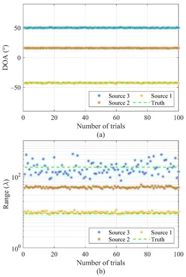 This subsection considers the mixed far-field and near-field sources scenario, which is more common in the real world. Two near-field sources located at DOA and range of (−42°, 9) and (16°, 50) and a far-field source located at (50°, 180) are incidents on the array of 20 elements. Figure 7a,b show the DOA and range estimation by the CVMD method of 100 independent trials, respectively. It can be seen that all of the trials yield accurate DOA estimations. For near-field sources, the estimates of the range are almost accurate, whereas, for the far-field source, they are of high variance. Since the goal for far-field sources is only to estimate the DOA, the range can be ignored as long as it can be separated from the near-field sources.