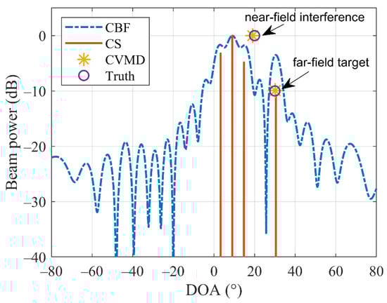 In practice, interference is often inevitable when locating the target source, which will easily cause false targets. In this simulation, we investigate the performance of our CVMD-method on far-field source DOA estimation in the presence of near-field interference. Suppose the far-field source is at 30°, the near-field interference locates at DOA and range of (20°, 25), the number of the array elements is set as 20, and the spacing is set as . Figure 8 shows the DOA estimation results by CBF, CS, and CVMD. It can be seen that the CBF and CS methods have false targets due to the near-field interference, which is misleading. On the contrary, the CVMD-based approach is robust with interference. It gives the correct DOA estimation of the far-field target without introducing false targets.