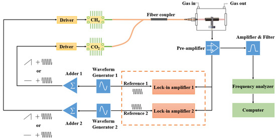 Figure 1 shows the instrument setup for a frequency-division multiplexing QEPAS sensor with the frequency-domain detection method. DFB lasers (NEL), operated at 1654 and 2004 nm, are selected as light sources for CH4 and CO2 detection. A CH4 absorption line at 1653.72 nm and a CO2 absorption line at 2004.02 nm are investigated in this experiment. The DFB lasers are controlled by home-made temperature and current drivers. Frequency-division multiplexing signals are generated with waveform generators (SDG1032X, Siglent, Shenzheng, China). The modulated laser beams are combined and then focused between the prongs of the QTF. Photoacoustic current from the QTF is converted to an output voltage by a trans-impedance amplifier and is then amplified again and filtered to enhance the signal-to-noise ratio. The center frequency of the bandpass filter is located at 32,713 Hz, and its bandwidth is compressed to 650 Hz. Output signals from the filter are processed by a real-time frequency analyzer (RSA5115B, Tektronix, OR, USA) with a sampling rate of 200 MHz and a resolution of 16 bits. To implement a comparison experiment, lock-in amplifiers (RS865A, Stanford Research Systems, Sunnyvale, CA, USA) are utilized to retrieve 2f components from the photoacoustic signals at different frequencies. The frequency-domain and time-domain signals are recorded and analyzed by a computer.