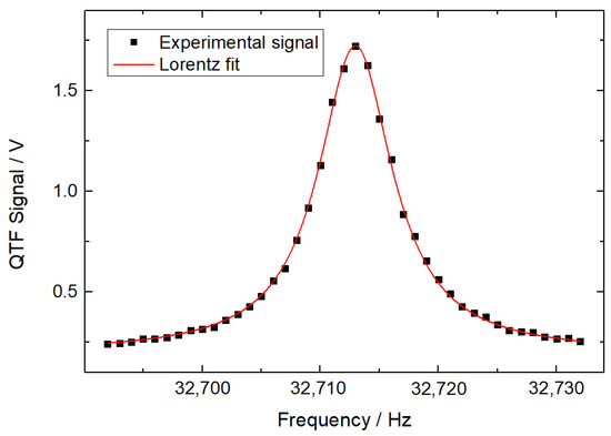 The frequency response of the QTF is shown in Figure 2. Sinusoidal signals of different frequencies were generated via a function generator to measure the frequency response of the QTF. The frequency of the sinusoidal signals was scanned from 32,688.00 to 32,732.00 Hz with a step of 1.00 Hz. Peak values of output signals from the QTF were fitted using the Lorentz profile-based nonlinear least square method. The calculated resonant frequency and response bandwidth of the QTF were 32,712.96 and 7.65 Hz, respectively, which led to a quality factor of 4267. To demonstrate the frequency-domain detection method for frequency-division multiplexing QEPAS sensors, modulation frequencies of 16,356.18 Hz for CH4 detection and 16,356.78 Hz for CO2 detection were selected. The corresponding second harmonic frequencies were located at 32,712.36 and 32,713.56 Hz with a 1.20-Hz interval.