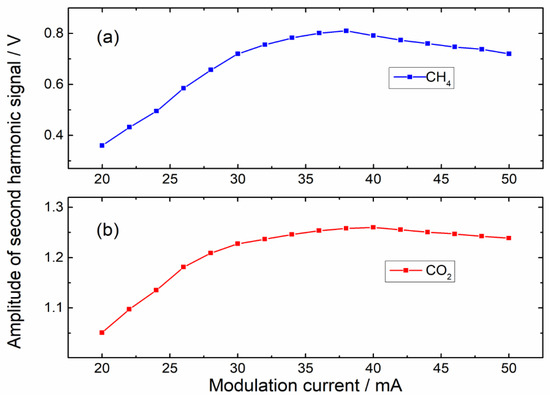 Since the laser modulation coefficient varied with the modulation current directly, the modulation current should be optimized to improve the amplitudes of 2f components. Two DFB lasers were operated alternately, and the sawtooth ramp signal of 0.1 Hz, superimposed with a sinusoidal modulation signal, was used to modulate laser injection currents. Gas samples of CH4 and CO2 were injected into the photoacoustic cell alternately with a flow rate of 50 mL/min. Lock-in amplifiers were utilized to retrieve 2f signals, and the amplitudes of 2f signals at various modulation currents are depicted in Figure 3. According to the result, modulation currents of 38 mA for CH4 and 40 mA for CO2 were selected in the subsequent experiments.